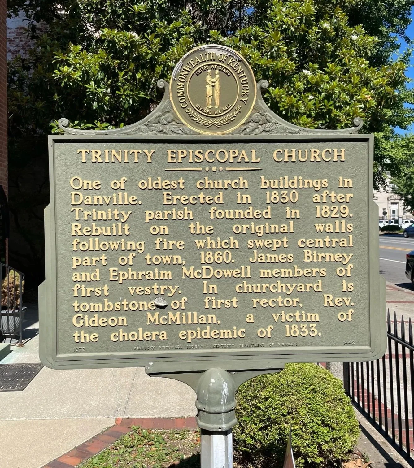 On June 2, 1829, a group of eight laymen met with The Rev. Dr. George T. Chapman, rector of Christ Episcopal Church, Lexington, and organized themselves to support an Episcopal Church in Danville, Kentucky. James Birney chaired the meeting and Dr. Ephraim McDowell introduced a resolution for the organization of the parish. McDowell was a renowned surgeon who performed the first successful removal of an ovarian tumor in Danville in 1809 and is known as the "Founder of Abdominal Surgery." James Birney was the father of James G. Birney, Liberty party candidate for U.S. president in 1840 and 1844. The parish was founded on June 20,1829 during the week after Trinity Sunday. The first vestry included Birney, McDowell, John Finley, Judge Edward Worthington, Philip Yeiser, Frederick Yeiser, and Daniel Yeiser.